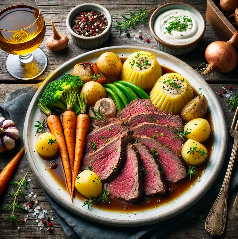 Il s’agit d’un morceau de bœuf bouilli lentement dans un bouillon aromatique, accompagné de légumes (carottes, poireaux, céleri) et d’épices (laurier…