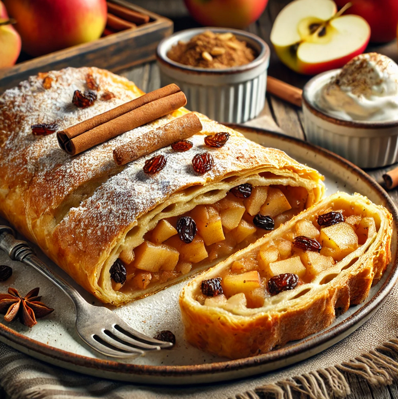 L’Apfelstrudel est un dessert classique viennois, aussi populaire en Bavière. Il s’agit d’une fine pâte étirée à la main, garnie d’un mélange de p…