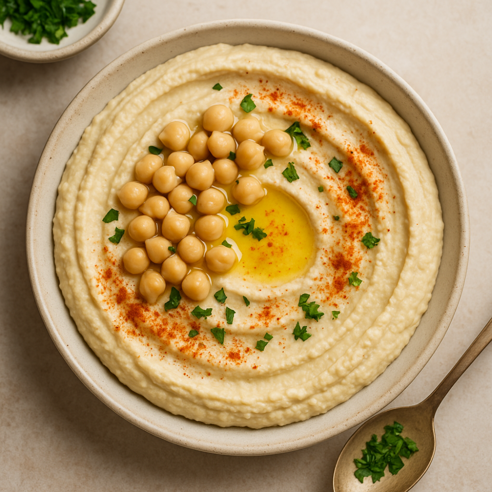 Ce houmous chypriote est présenté dans une assiette ronde aux tons naturels, et sa texture veloutée attire immédiatement l'œil par sa finesse et son o…