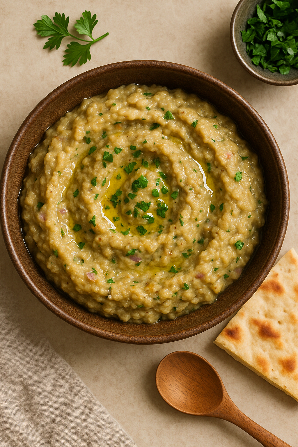 Dans un bol en céramique rustique aux teintes brunes chaleureuses repose une généreuse portion de melitzanosalata, cette purée d’aubergine typiquement mé…