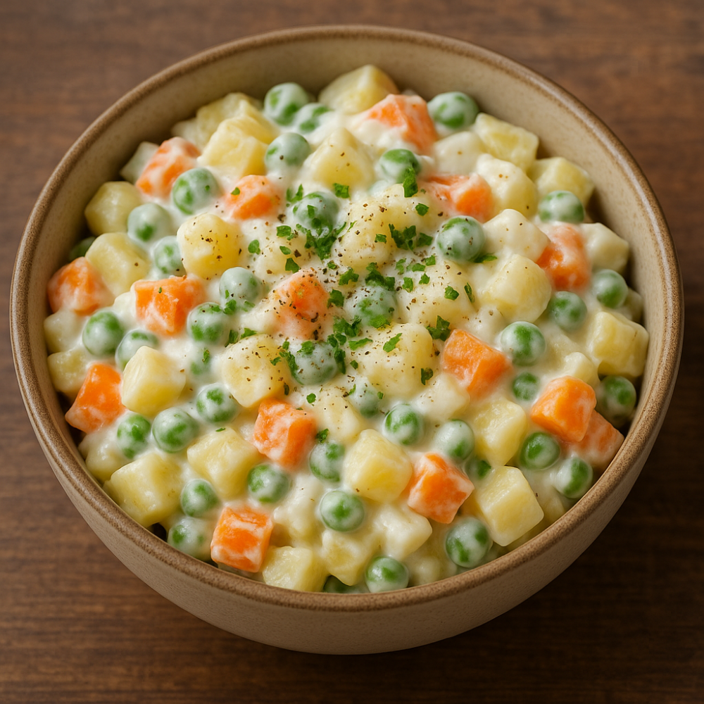 Présentée dans un bol en céramique sobre et rustique, l’Ensalada Rusa dévoile ses dés réguliers de pommes de terre et de carottes cuits à point, mêlé…